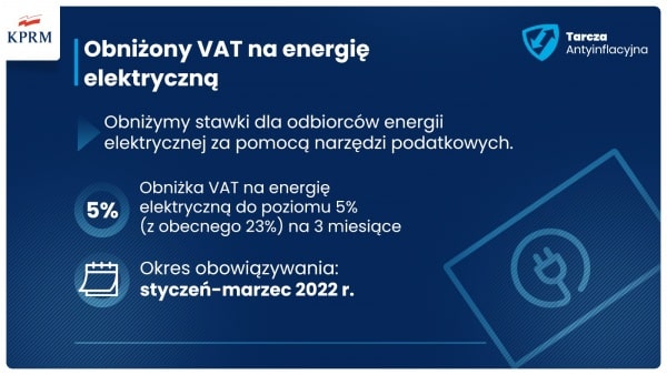 Jeśli chodzi o energię elektryczną zaplanowano zwolnienie z akcyzy gospodarstw domowych (z 5 zł/MWh do 0 zł/MWh). Reszta odbiorców zapłaci rachunki za prąd ze stawką akcyzy na minimalnym dopuszczalnym przez Unię Europejską poziomie. Rząd zadeklarował również obniżenie podatku VAT na energię elektryczną. Będzie to działanie czasowe i obejmie okres od stycznia do marca 2022 r. Wówczas prąd będzie opodatkowany stawką na poziomie 5 proc., a nie 23 proc.