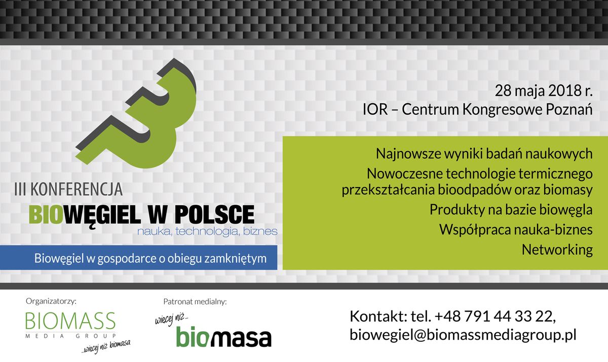 Konferencja Biowęgiel w Polsce – nauka, technologia, biznes odbędzie się w maju. Już dzisiaj zapraszamy do sprawdzenia programu, oferty, pakietów sponsorskich, a także do rejestracji.