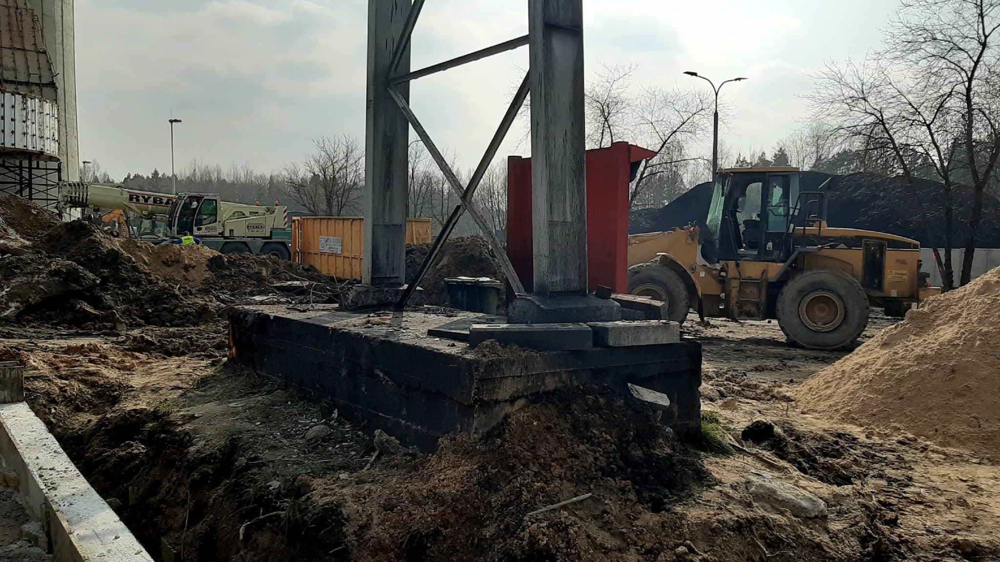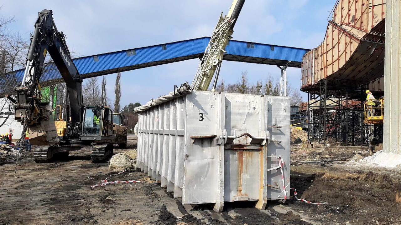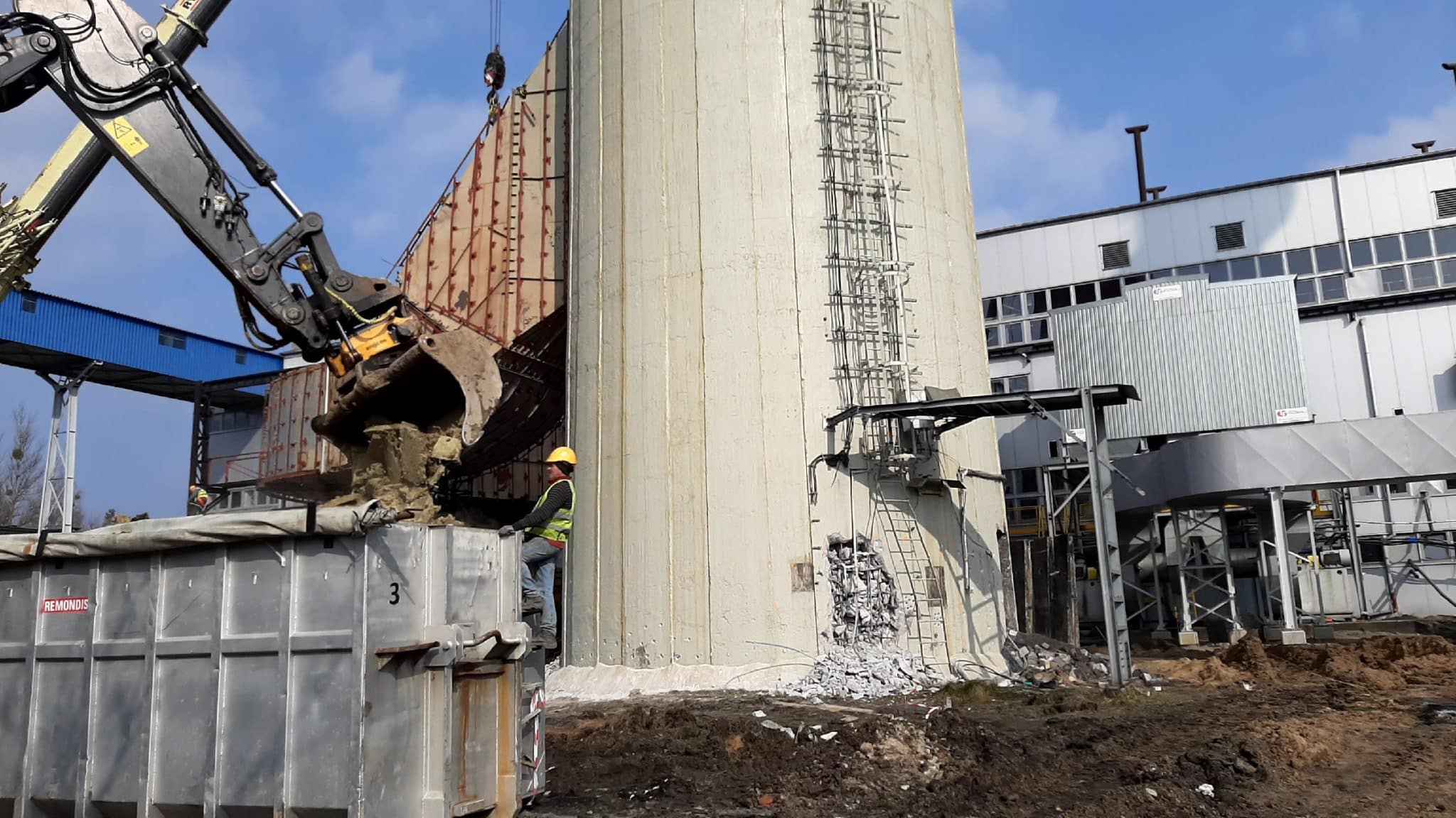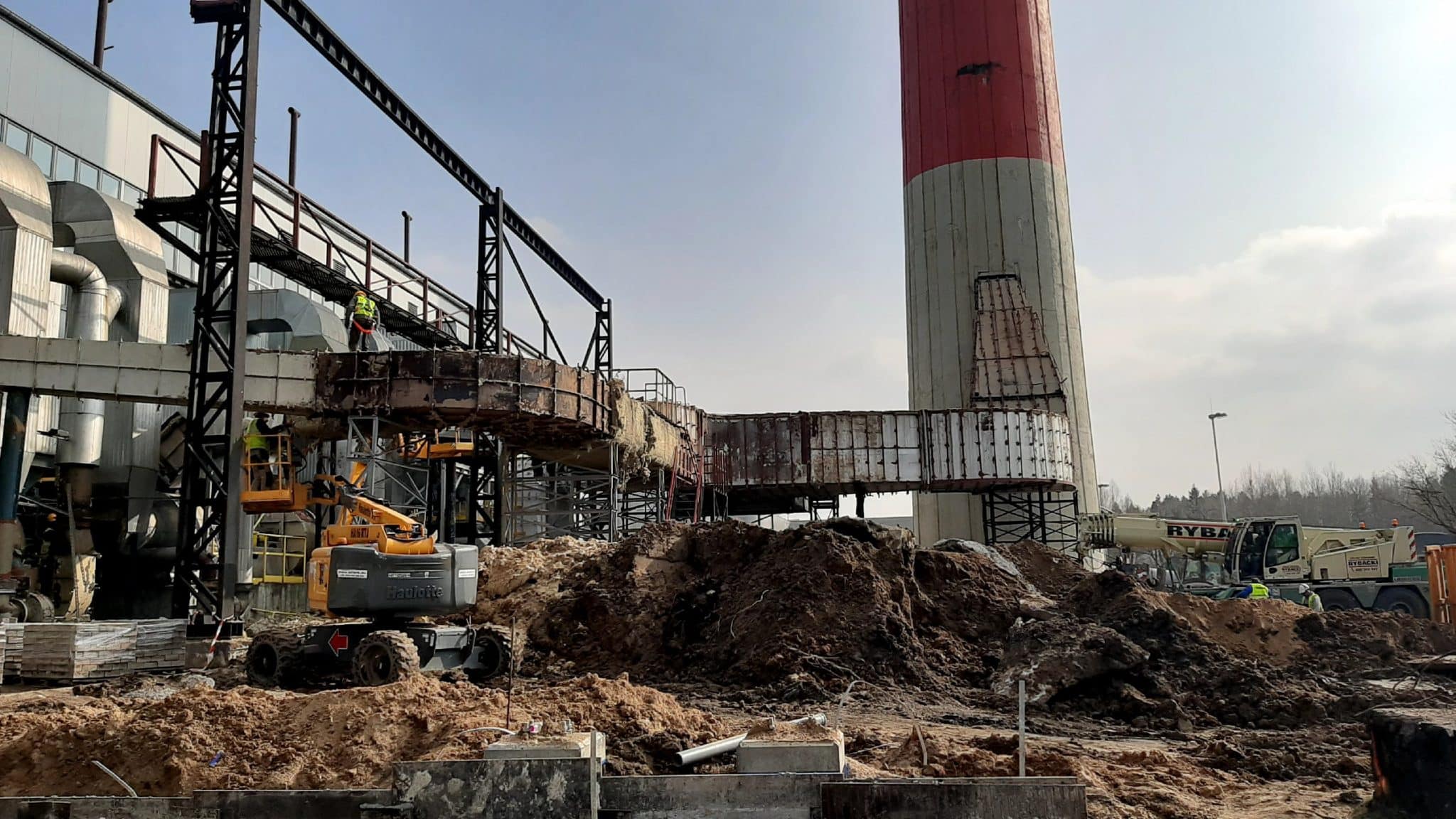 Obiekt został wyburzony metodą strzałową, co pozwoliło na szybkie i bezpieczne położenie komina.