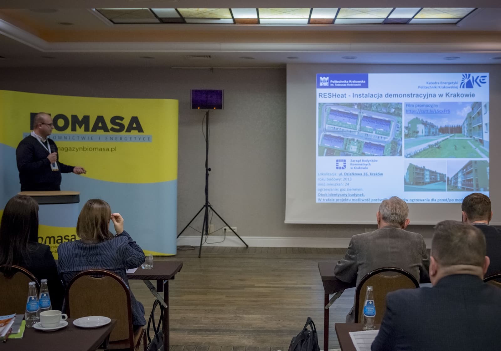 Ostatnia prelekcja podczas tej sesji dotyczyła systemu RESHeat jako systemu trigeneracji energii, który szeroko omówił przedstawiciel Politechniki Krakowskiej, dr inż. Piotr Paweł Cisek. RESHeat to system trigeneracji, a więc wykorzystujący OZE do produkcji energii elektrycznej i cieplnej oraz chłodu. Oparty jest głównie o energię słoneczną. Celem projektu przygotowywanego przez Politechnikę Krakowską przy udziale partnerów jest pokrycie z OZE co najmniej 70% rocznego zapotrzebowania na energię dla wielorodzinnych budynków mieszkalnych i wprowadzenie systemu do komercjalizacji.