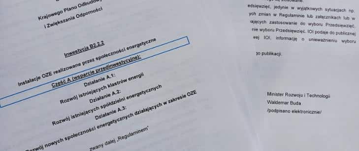 9 sierpnia br. Minister Rozwoju i Technologii Waldemar Buda zatwierdził regulamin wyboru przedsięwzięć, którego celem jest wyłonienie 139 projektów klastrów energii, spółdzielni energetycznych i samorządów, w ramach których przygotowana zostanie dokumentacja dla inwestycji w odnawialne źródła energii. Budżet tego naboru wynosi blisko 187 mln zł.