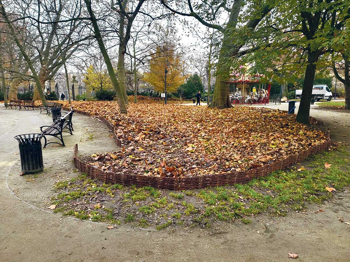 Jak w praktyce wygląda „gospodarka” liśćmi? Po pierwsze – wyznacza się obszary, na których są one pozostawiane. W Parku Staromiejskim wrocławski ZZM zastosował wiklinowe ogrodzenia, które umożliwiają pozostawienie liści w kontrolowanych miejscach. Ich rola? Mają zatrzymać materię organiczną dokładnie tam, gdzie powinna trafić – pod drzewami i krzewami. W celach edukacyjnych, w takich miejscach ustawiane są ponadto tablice z komunikatem: „Tu nie grabimy! Dajemy schronienie zwierzętom, użyźniamy i chronimy glebę”.
