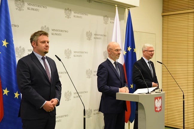 Na zdjęciu: P.o. prezesa NFOŚiGW Dominik Bąk, minister klimatu Michał Kurtyka, wiceminister klimatu Ireneusz Zyska na konferencji prasowej dot. programu „Mój Prąd”.