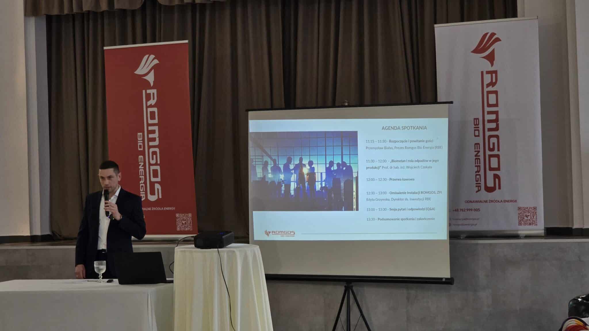 Następnie delegacje udały się do sali konferencyjnej w Karmazyn Brody, w której zaplanowane zostały panele ekspertów. W pierwszej kolejności, Przemysław Białas, prezes zarządu Romgos Bio Energia, powitał uczestników i wygłosił prezentację na temat rosnącej roli biometanu w zmieniającym się krajobrazie energetycznym Europy. Zwrócił uwagę, że biometan to inwestycja w przyszłość – zarówno pod kątem zrównoważonego rozwoju, jak i korzyści dla lokalnych społeczności.
