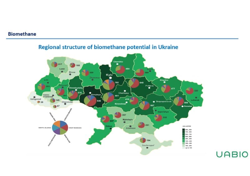 Potencjał w kwestii rozmieszczenia biometanowni w różnych częściach kraju przedstawia powyższa mapa. Największy udział w wytwarzaniu zielonego gazu może mieć centralna część państwa. Obwód kijowski, winnicki, czernichowski, potławski i chmielnicki – to te regiony są najbogatsze pod względem ilości dostępnego substratu.
