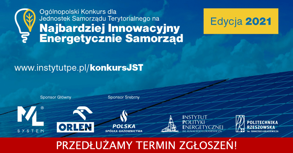Trwa Ogólnopolski Konkurs dla Jednostek Samorządu Terytorialnego na Najbardziej Innowacyjny Energetycznie Samorząd. Konkurs organizuje Instytut Polityki Energetycznej im Ignacego Łukasiewicza w Rzeszowie, wspólnie z partnerami. Termin zgłoszeń został przedłużony!