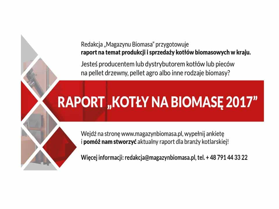 - Na podstawie przesłanych informacji redakcja „Magazynu Biomasa” przygotuje raport branżowy „Kotły na biomasę 2017”. Raport będzie dostępny bezpłatnie dla wszystkich firm, które wezmą udział w badaniu. Informacje, które znajdą się w raporcie będą opublikowane na łamach „Magazynu Biomasa”, stronie magazynbiomasa.pl oraz innych portalach i czasopismach współpracujących z wydawnictwem Biomass Media Group Sp. z o.o.